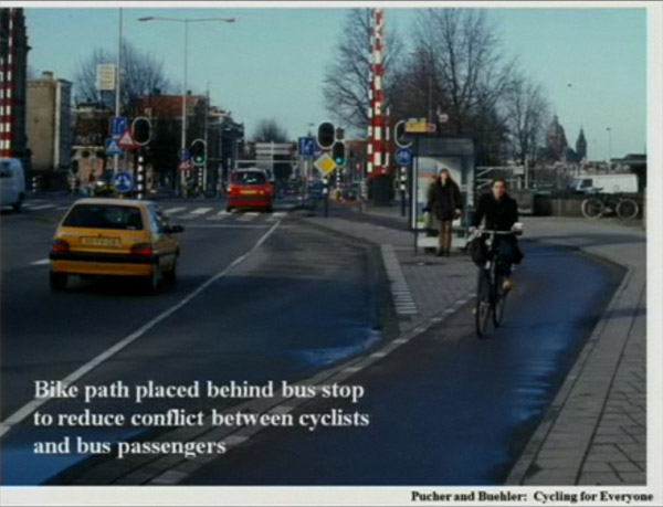 Cycling path behind bus stop to avoid conflict with pedestrian