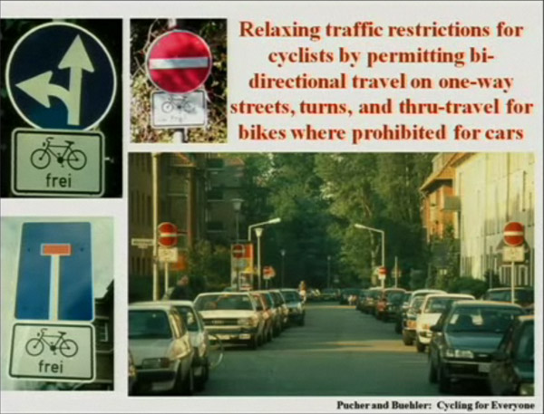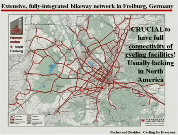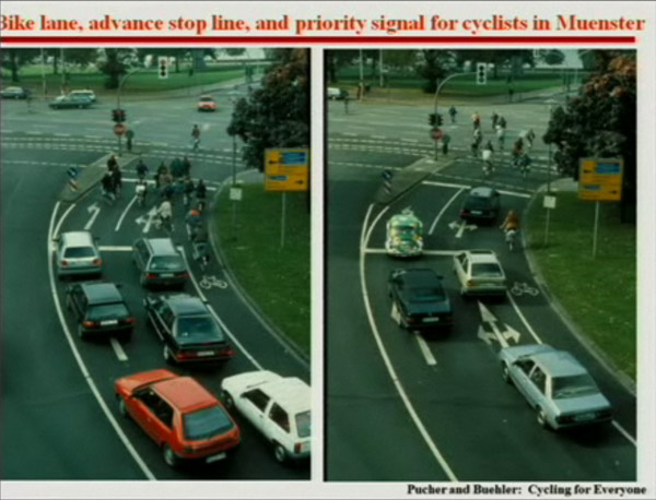 More interesting for me, he also show many inspiring examples of how better road design can facilitate safe cycling. Here are some of the slides: