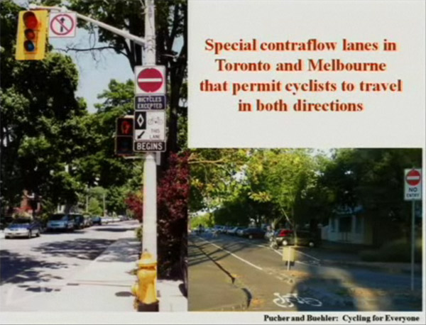 Cyclist allow to travel both way on one way street in Toronto and Melbourne